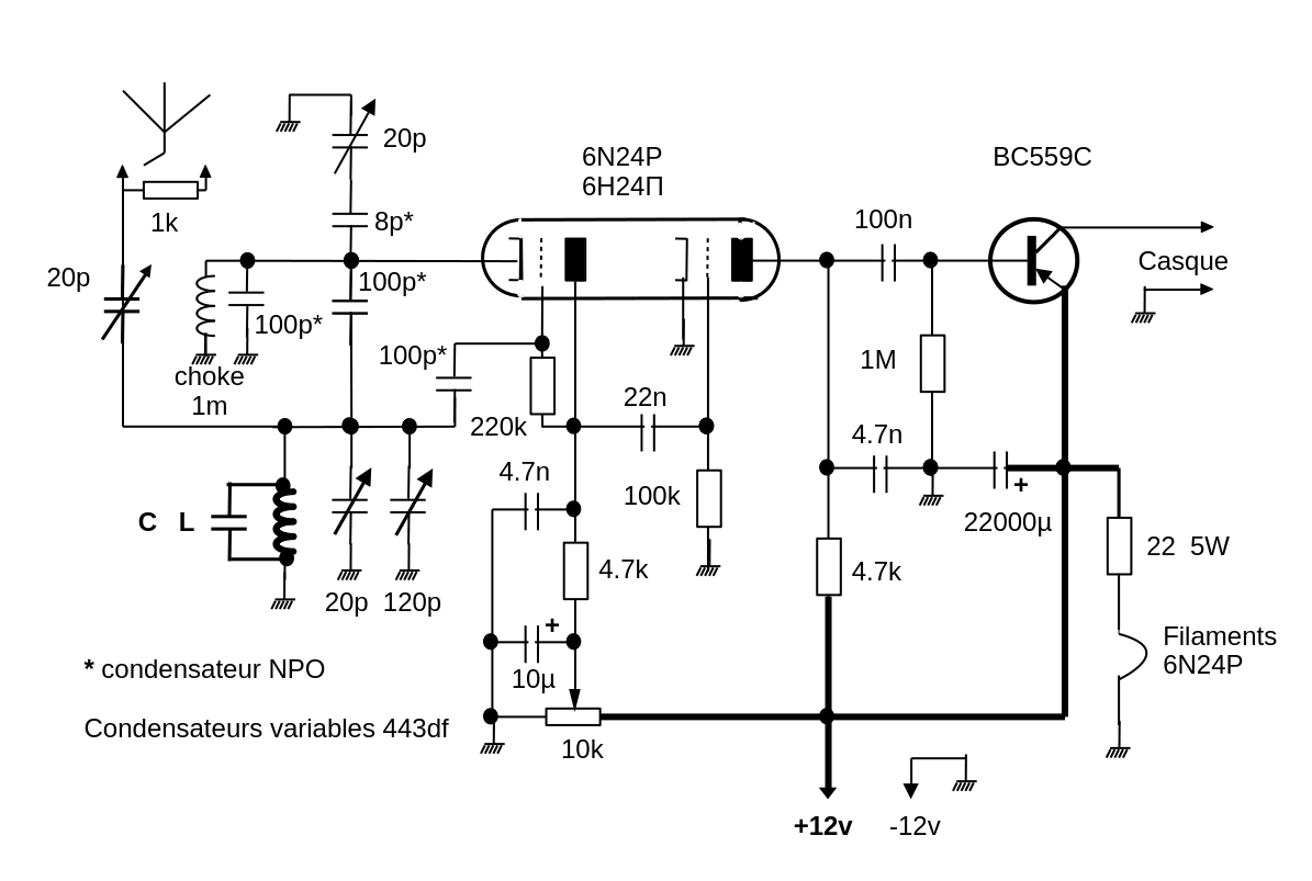 En dehors de la lampe, tous les composants doivent être encore fabriqués. La lampe choisie est un tube soviétique 6N24P (6H24П) à grande pente (12.5 mA/V), facilement disponible en neuf sur Ebay. Il fait partie de la série des tubes à grille-cadre (ECC88, ECC189, 6N23P, EF183, EF184, etc.) conçus à la fin des années 1950 pour une amplification à faible bruit en VHF. Une des caractéristiques méconnues de ces tubes est qu’ils fonctionnent correctement avec une tension anodique très faible. Les bobines interchangeables sont réalisées avec des inductances du commerce 12 ou 26 tours, avec noyau de ferrite, fixées sur des fiches DIN 4 broches. Les condensateurs variables sont des condensateurs plastic prévus pour les radios analogiques AM FM. L’absence de démultiplicateur impose l’emploi de 3 condensateurs variables : calage de la bande, accord approximatif, accord fin. Ces condensateurs (443DF) ont une faible stabilité mécanique et thermique. En SSB où la stabilité en fréquence est primordiale, il faut qu’ils couvrent la plus faible gamme possible. Il faut donc ajouter un condensateur fixe en parallèle de la bobine d’accord et ne pas dépasser la première moitié du condensateur variable de 120 pF pour le calage de la bande. Du fait du profil linéaire en fréquence, sa capacité n’est que de 36 pF à mi-course. Les condensateurs fixes participants au circuit d’accord doivent être des condensateurs NPO du type céramique multicouche.