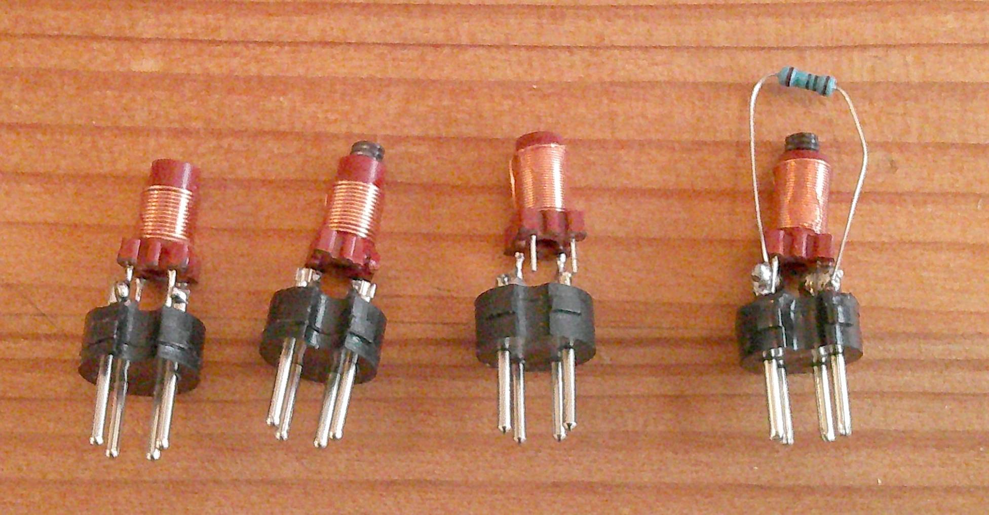 Les bobines interchangeables sont constituées de bobines du commerce (avec en parallèle pour les bandes amateurs un condensateur fixe) soudées sur la partie mâle d’un connecteur DIN 4 broches, même si seules 2 broches sont utiles. Les bobines « A » 0,6 à 1,7 µH ont 12 spires, les bobines « B » 2,1 à 6,3 µH ont 26 spires. Quand un noyau de ferrite est utilisé, une fois le réglage effectué, il faut le fixer avec de la colle cyanolite. Dans tous les cas, il est aussi utile de fixer les spires au mandrin avec un peu de cyanolite.