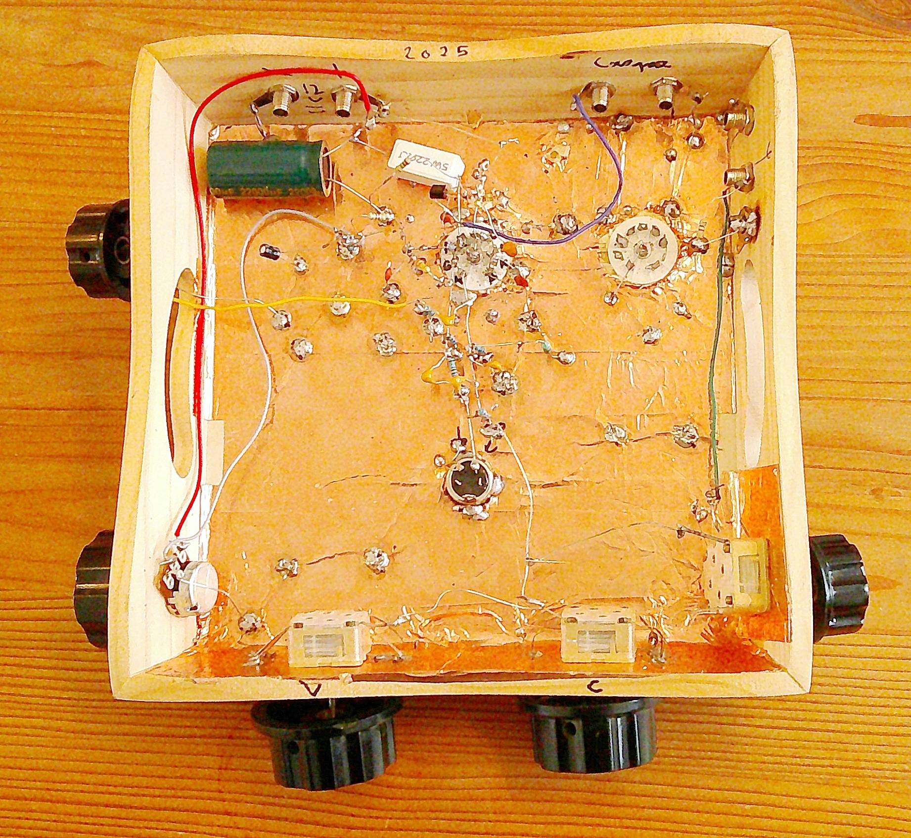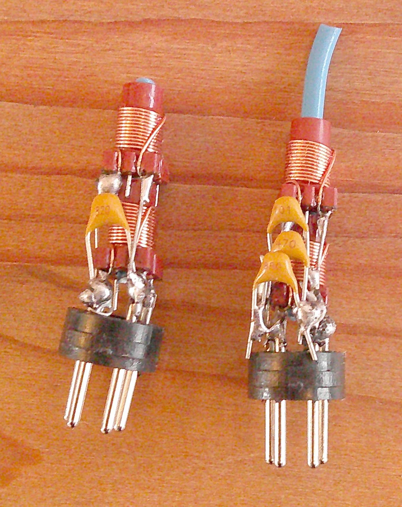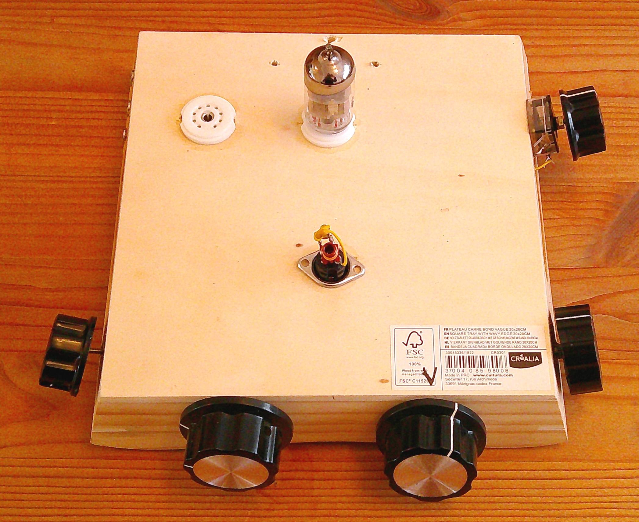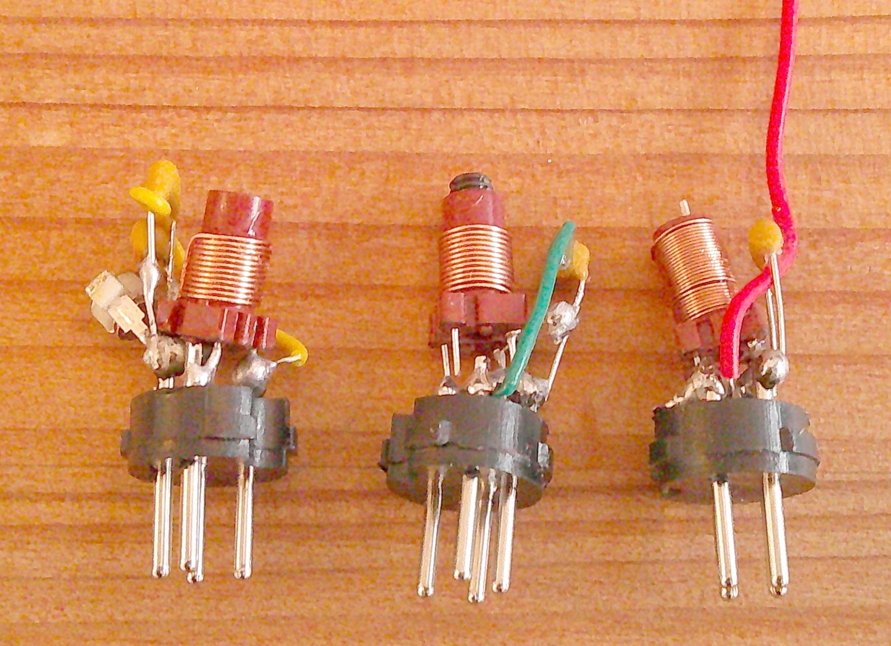En dehors de la lampe, tous les composants doivent être encore fabriqués. La lampe choisie est un tube soviétique 6N24P (6H24П) à grande pente (12.5 mA/V), facilement disponible en neuf sur Ebay. Il fait partie de la série des tubes à grille-cadre (ECC88, ECC189, 6N23P, EF183, EF184, etc.) conçus à la fin des années 1950 pour une amplification à faible bruit en VHF. Une des caractéristiques méconnues de ces tubes est qu’ils fonctionnent correctement avec une tension anodique très faible. Les bobines interchangeables sont réalisées avec des inductances du commerce 12 ou 26 tours, avec noyau de ferrite, fixées sur des fiches DIN 4 broches. Les condensateurs variables sont des condensateurs plastic prévus pour les radios analogiques AM FM. L’absence de démultiplicateur impose l’emploi de 3 condensateurs variables : calage de la bande, accord approximatif, accord fin. Ces condensateurs (443DF) ont une faible stabilité mécanique et thermique. En SSB où la stabilité en fréquence est primordiale, il faut qu’ils couvrent la plus faible gamme possible. Il faut donc ajouter un condensateur fixe en parallèle de la bobine d’accord et ne pas dépasser la première moitié du condensateur variable de 120 pF pour le calage de la bande. Du fait du profil linéaire en fréquence, sa capacité n’est que de 36 pF à mi-course. Les condensateurs fixes participants au circuit d’accord doivent être des condensateurs NPO du type céramique multicouche.